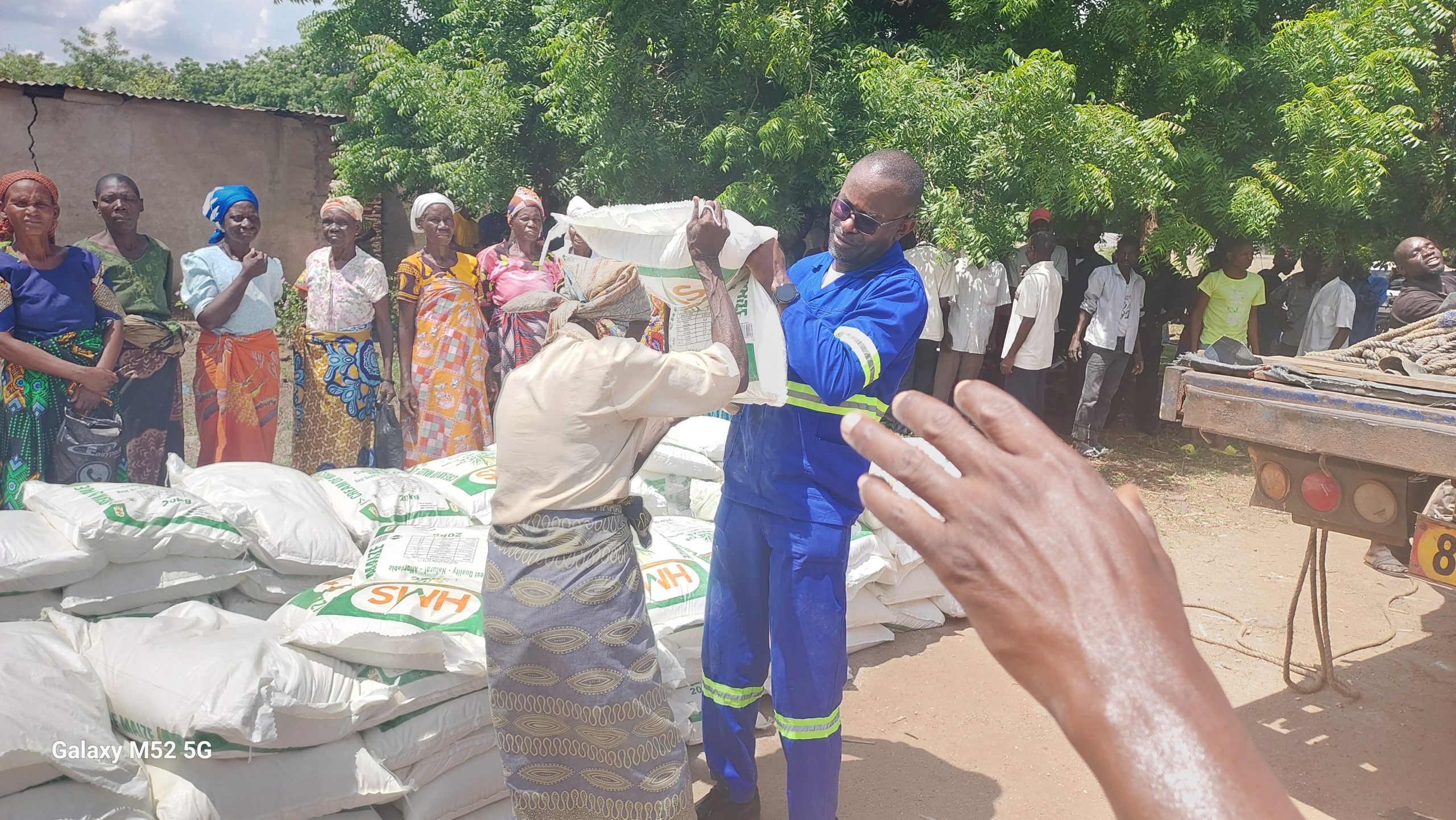 The Human Resource Manager for the Stephanos Foundation was tasked to do the distribution in the districts of Chikwawa and Nsanje. In the picture the Human Resource Manager (Robin Kajasiche) in a worksuit, helps one of the elderly carry a 20 kilogrammes bag of maize flour.